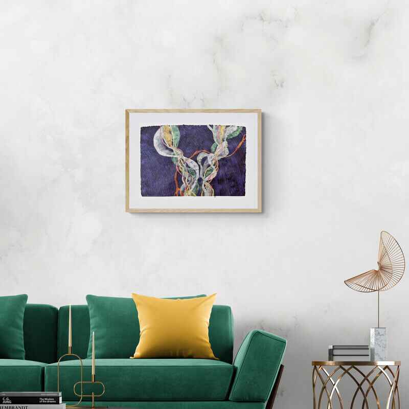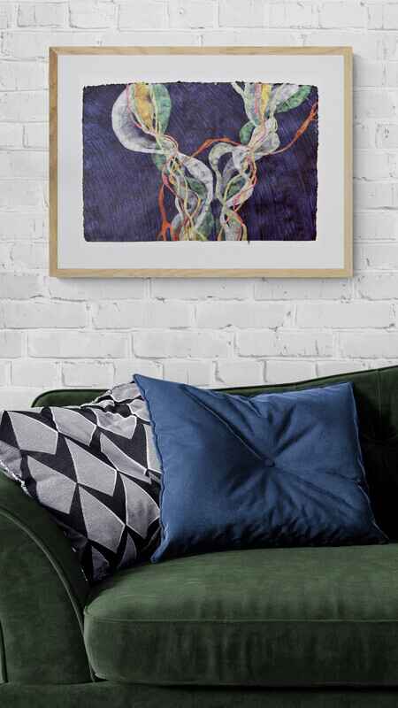 Watercolour on thick handmade indigo paper. The watercolours have a metallic effect, so the colours of this painting will look different, depending on the light. They are also very difficult to photograph because of this! The paper is coarse, uneven and heavily textured, with a deckled edge.