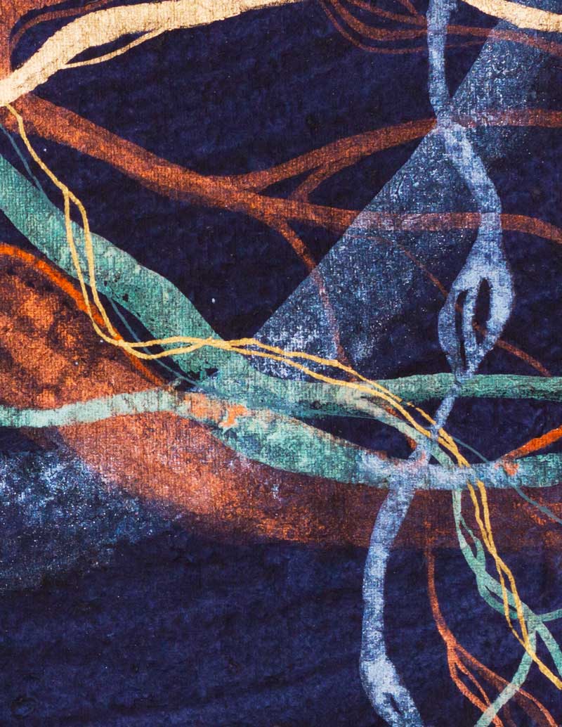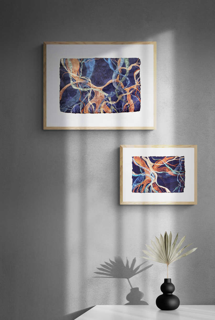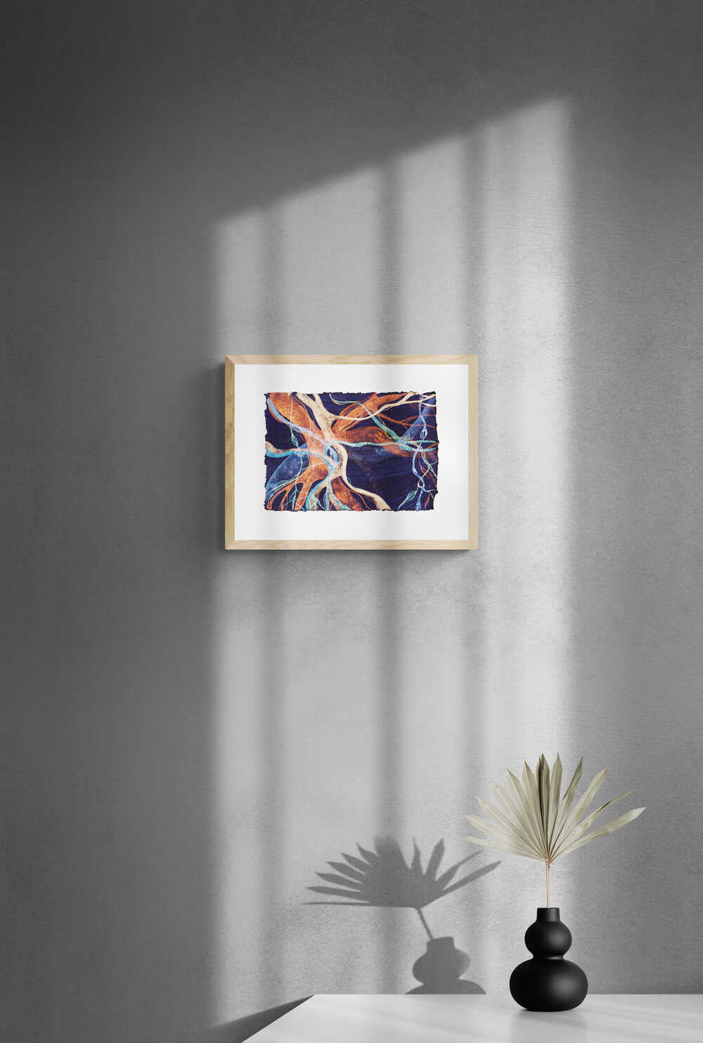 Watercolour on thick handmade indigo paper. The watercolours have a metallic effect, so the colours of this painting will look different, depending on the light. It is also very difficult to photograph because of this! The paper is coarse, uneven and heavily textured, with a deckled edge.