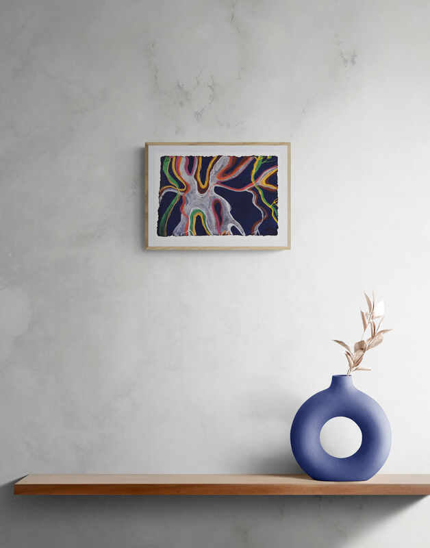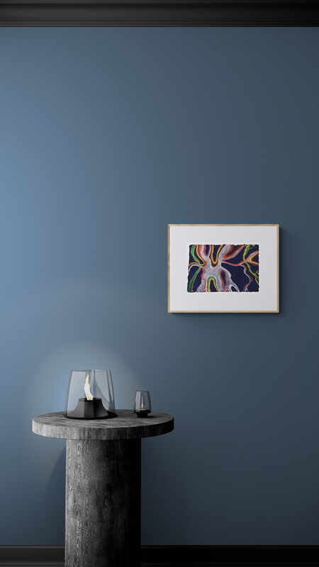 Watercolour on thick handmade indigo paper. The watercolours have a metallic effect, so the colours of this painting will look different, depending on the light. It is also very difficult to photograph because of this! The paper is coarse, uneven and heavily textured, with a deckled edge.